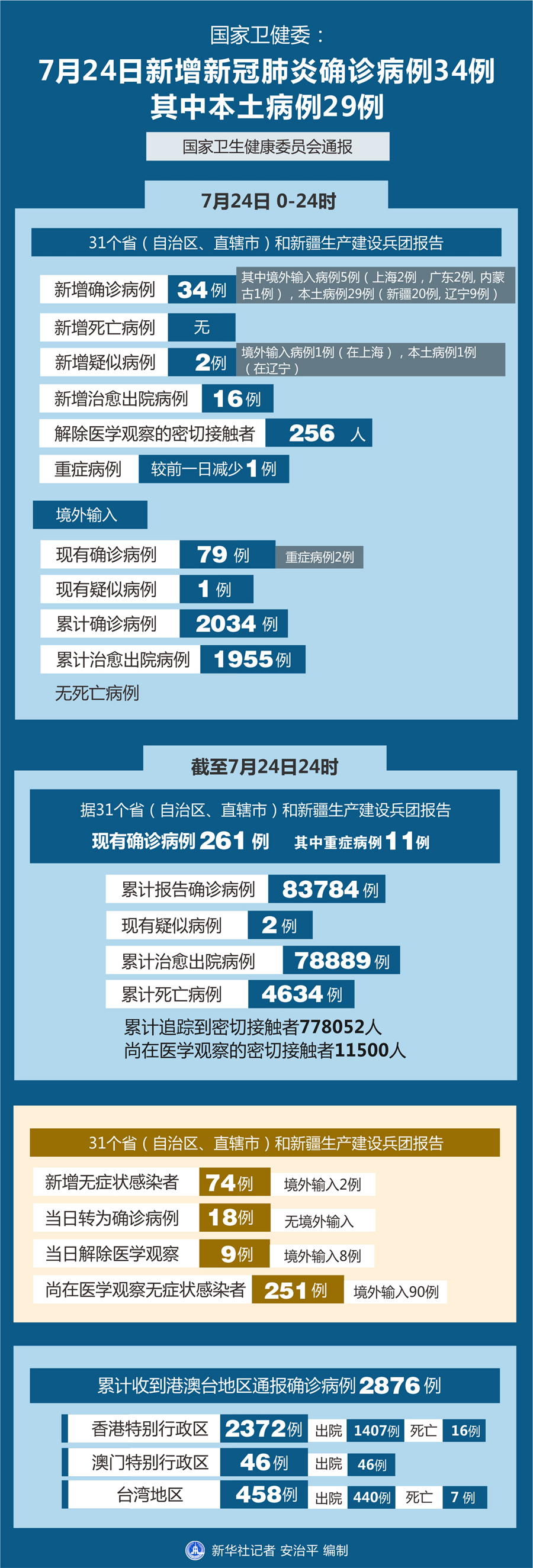 新華社北京7月25日電 國(guó)家衛(wèi)生健康委員會(huì)25日通報(bào),7月24日0-24時(shí),31個(gè)省(自治區(qū)、直轄市)和新疆生產(chǎn)建設(shè)兵團(tuán)報(bào)告新增新冠肺炎確診病例34例,其中境外輸入病例5例(上海2例,廣東2例,內(nèi)蒙古1例),本土病例29例(新疆20例,遼寧9例);無(wú)新增死亡病例;新增疑似病例2例,其中境外輸入病例1例(在上海),本土病例1例(在遼寧)。