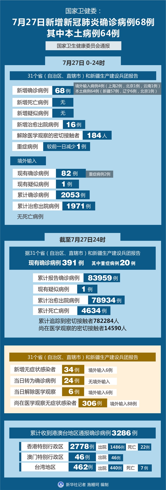 新華社北京7月28日電 國家衛生健康委員會28日通報,7月27日0—24時,31個省(自治區、直轄市)和新疆生產建設兵團報告新增新冠肺炎確診病例68例,其中境外輸入病例4例(上海2例,北京1例,云南1例),本土病例64例(新疆57例,遼寧6例,北京1例);無新增死亡病例;無新增疑似病例。