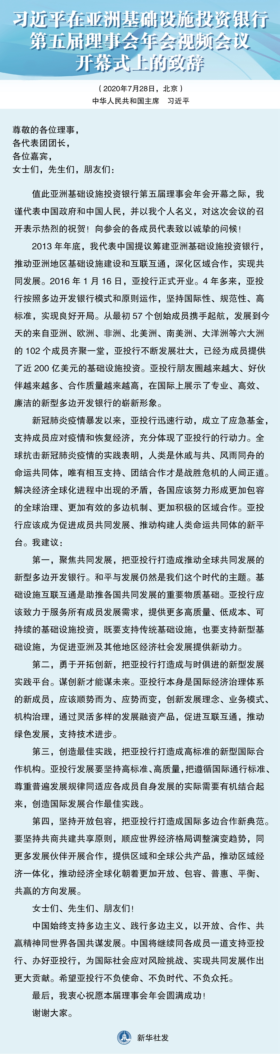 在亞洲基礎設施投資銀行第五屆理事會年會視頻會議開幕式上的致辭