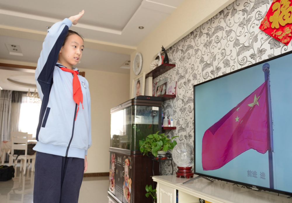 2月29日,呼和浩特,一名小學(xué)生在家中參加線上升旗儀式