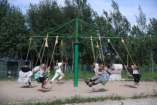 孟文龍民宿院內鄂溫克少年在玩旋轉秋千。新華網記者焦鵬攝