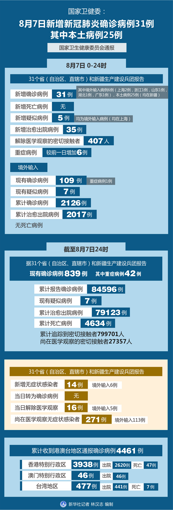 截至8月7日24時(shí),據(jù)31個(gè)省(自治區(qū)、直轄市)和新疆生產(chǎn)建設(shè)兵團(tuán)報(bào)告,現(xiàn)有確診病例839例(其中重癥病例42例),累計(jì)治愈出院病例79123例,累計(jì)死亡病例4634例,累計(jì)報(bào)告確診病例84596例,現(xiàn)有疑似病例7例。累計(jì)追蹤到密切接觸者799701人,尚在醫(yī)學(xué)觀察的密切接觸者27357人。