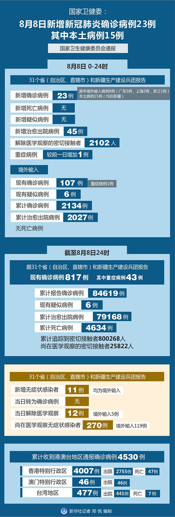 新華社北京8月9日電 國家衛生健康委員會9日通報,8月8日0—24時,31個省(自治區、直轄市)和新疆生產建設兵團報告新增新冠肺炎確診病例23例,其中境外輸入病例8例(廣東5例,上海2例,浙江1例),本土病例15例(均在新疆);無新增死亡病例;無新增疑似病例。