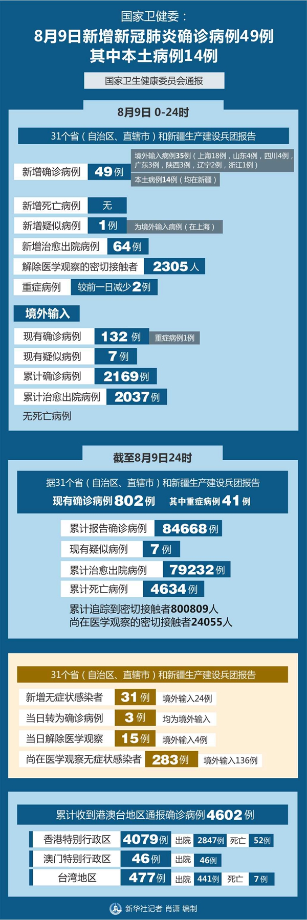 截至8月9日24時(shí),據(jù)31個(gè)省(自治區(qū)、直轄市)和新疆生產(chǎn)建設(shè)兵團(tuán)報(bào)告,現(xiàn)有確診病例802例(其中重癥病例41例),累計(jì)治愈出院病例79232例,累計(jì)死亡病例4634例,累計(jì)報(bào)告確診病例84668例,現(xiàn)有疑似病例7例。累計(jì)追蹤到密切接觸者800809人,尚在醫(yī)學(xué)觀察的密切接觸者24055人。