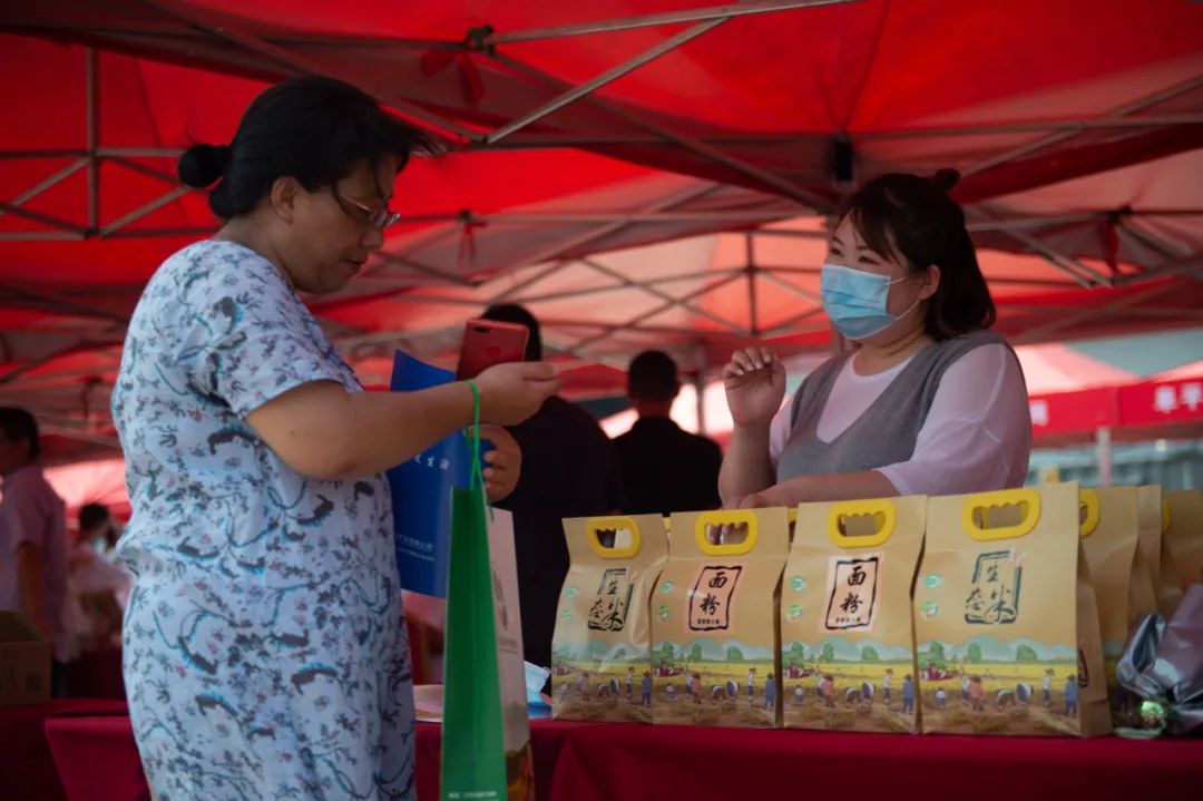 在扶貧產(chǎn)品展銷會(huì)上,扶貧企業(yè)代表(右)向采購(gòu)者介紹扶貧農(nóng)產(chǎn)品 陳鐘昊 攝