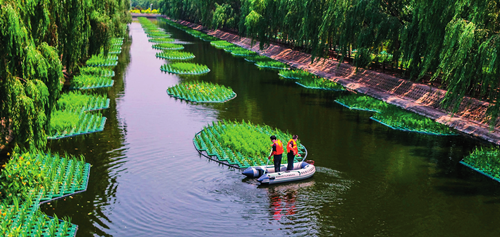河北省雞澤縣在河道治理中采用“生態(tài)浮島”技術(shù),種植挺水植物,既美化了河道,又凈化了水體,達到了生態(tài)治污效果(6 月 20 日攝)王曉攝
