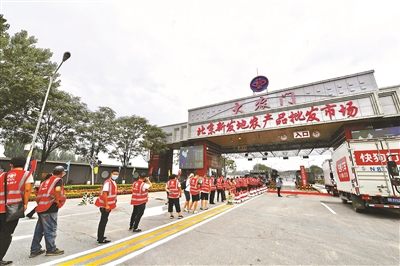 “昨天有1000多輛貨車、2000名賣家、近1.3萬噸蔬菜水果進場,售賣商品包括18種蔬菜、16種水果?!北本┬掳l地農產品批發市場常務副總經理顧兆學介紹,新發地市場主市場鐵路以南區域共有5個大門,其中,大農門、富農門為批發區入口,三農門、裕農門為批發區出口,強農門為上貨區出入口,所有“大門”只出不入或只入不出。