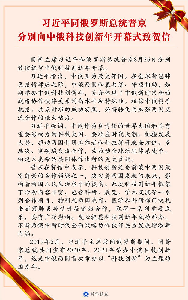 新華社北京8月26日電 國家主席習近平和俄羅斯總統普京26日分別致信祝賀中俄科技創新年開幕。