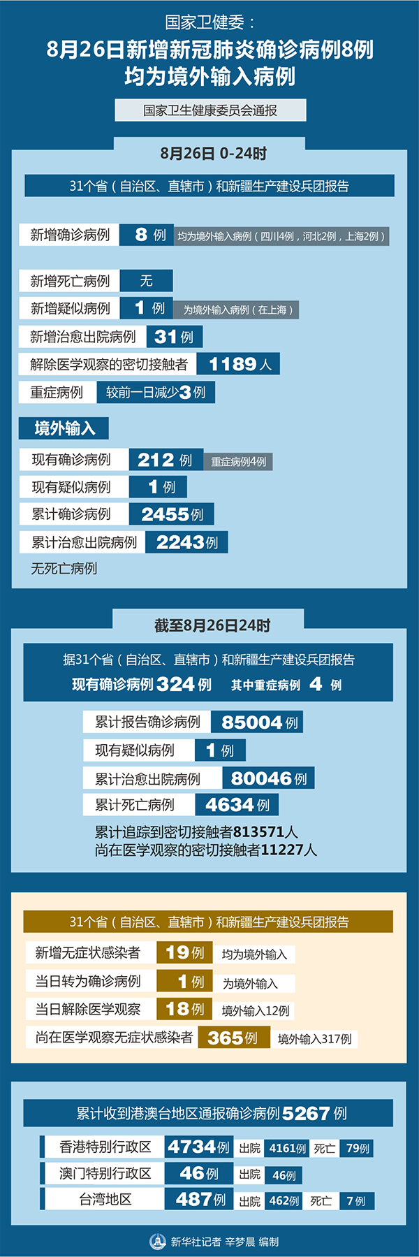 新華社北京8月27日電? 國家衛(wèi)健委27日通報,8月26日0—24時,31個省(自治區(qū)、直轄市)和新疆生產(chǎn)建設(shè)兵團報告新增確診病例8例,均為境外輸入病例(四川4例,河北2例,上海2例);無新增死亡病例;新增疑似病例1例,為境外輸入病例(在上海)。