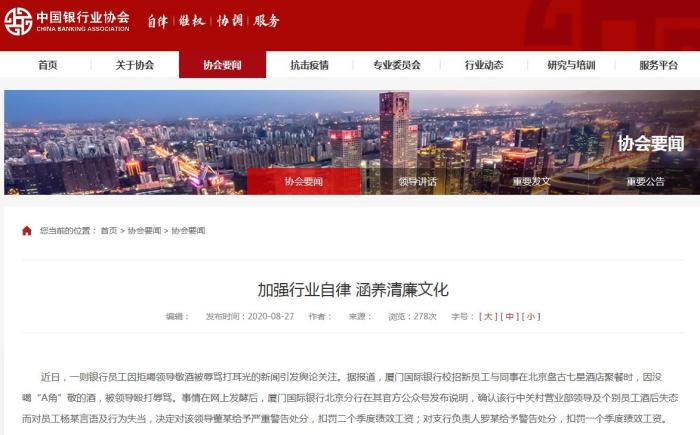 8月24日,廈門國際銀行北京分行發文證實此事并致歉。該行表示,員工楊某反映的中關村支行營業部某領導及該支行個別員工在私下非公款聚餐中,確系存在因酒后失態而對楊某做出言語及行為失當等舉動,上述行為確實對其本人造成了影響和傷害,對此深表歉意。