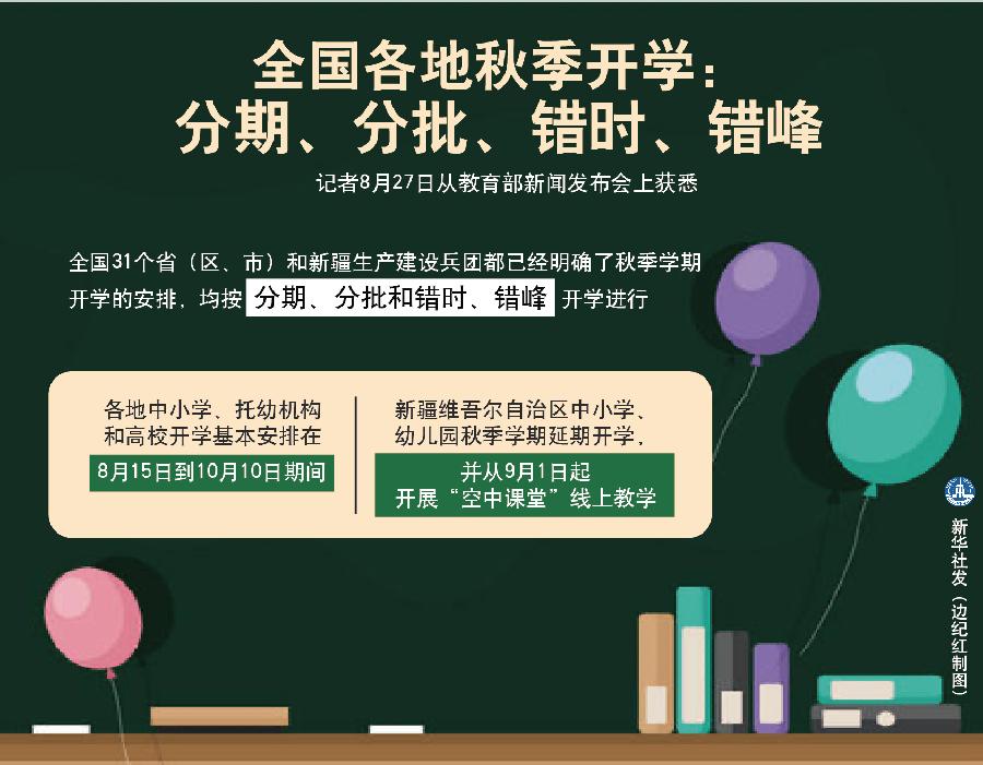 教育部應(yīng)對新冠肺炎疫情工作領(lǐng)導(dǎo)小組辦公室主任、體育衛(wèi)生與藝術(shù)教育司司長王登峰介紹說,各地中小學(xué)、托幼機(jī)構(gòu)和高校開學(xué)基本安排在8月15日到10月10日期間。新疆維吾爾自治區(qū)中小學(xué)、幼兒園秋季學(xué)期延期開學(xué),并從9月1日起開展“空中課堂”線上教學(xué)。