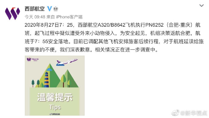8月27日,西部航空官方微博通報(bào)稱(chēng),7時(shí)25分,合肥飛往重慶的PN6252航班在起飛途中疑似遭受外來(lái)小動(dòng)物侵入,為安全起見(jiàn),機(jī)組決定返航,航班于7時(shí)55分安全降落。記者從西部航空獲悉,隨后,航空公司安排另一架客機(jī)于10時(shí)01分運(yùn)送該航班乘客,并于11時(shí)50分安全落地重慶。西部航空稱(chēng),除原航班延誤外,返航事件未對(duì)乘客、航司及合肥新橋國(guó)際機(jī)場(chǎng)造成其他影響。導(dǎo)致客機(jī)返航的具體原因仍在調(diào)查中。(記者林翔、汪奧娜)