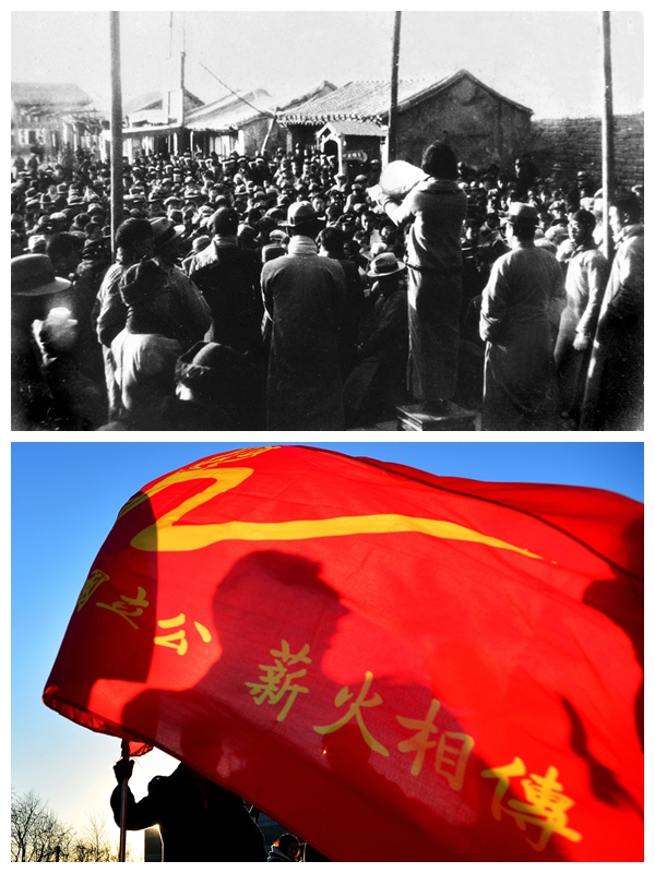 上圖為1935年12月9日,“一二·九”運動在北平爆發(fā)。這是被軍警擋在西直門外的大中學(xué)學(xué)生就地發(fā)表抗日演講。