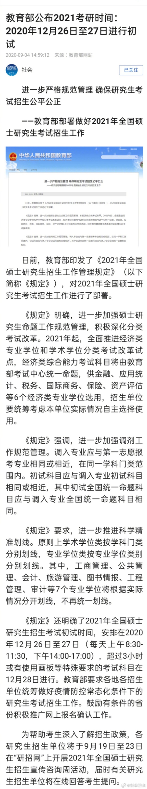 日前,教育部印發了《2021年全國碩士研究生招生工作管理規定》(以下簡稱《規定》),對2021年全國碩士研究生考試招生工作進行了部署。