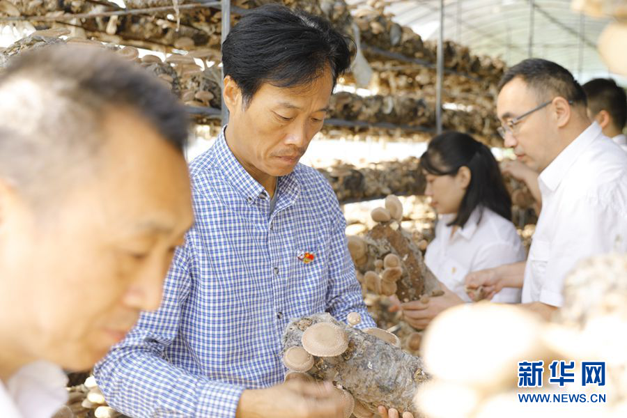 ??? 在第一書記郭旗(左二)的動員下,2019年9月,中國鐵路西安局集團有限公司西安供電段黨員、干部到唐灣村幫助村民采摘豐收的香菇。新華網發(西安供電段駐唐灣村扶貧工作隊供圖)