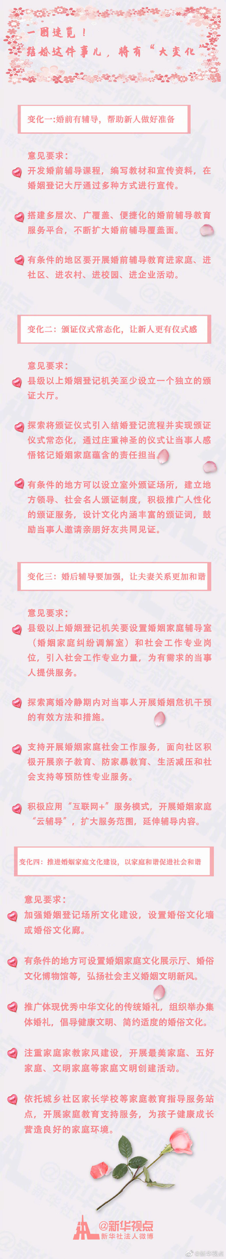 婚姻是家庭的紐帶,婚姻家庭和諧事關民生幸福和社會穩(wěn)定。意見要求,要探索開展婚前輔導,開發(fā)婚前輔導課程,編寫教材和宣傳資料,在婚姻登記大廳通過宣傳欄、視頻、免費贈閱等方式進行宣傳,幫助當事人做好進入婚姻狀態(tài)的準備,學會管理婚姻,努力從源頭上減少婚姻家庭糾紛的產生。