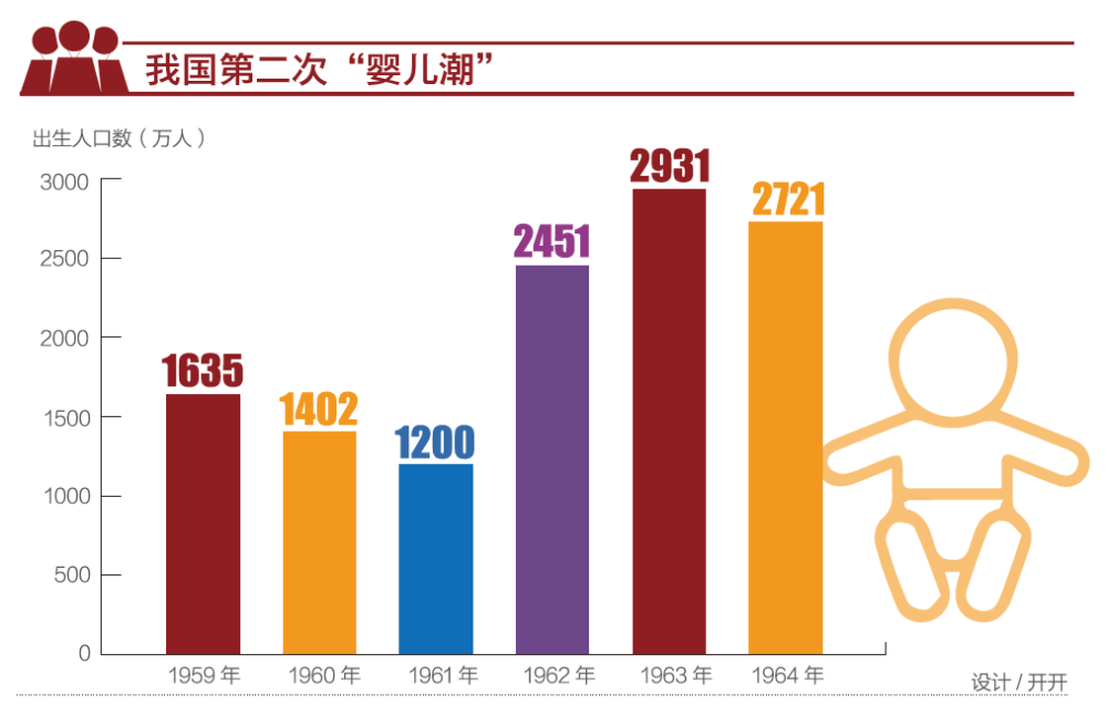 大家都知道,上世紀三年自然災害結束后,我國迎來了第二次“嬰兒潮”。三年自然災害的第一年、1959年我國出生人口是1635萬,1960年是1402萬,1961年下降到最低,是1200萬。緊接著就是“嬰兒潮”,1962年是2451萬,1963年達到峰值2931萬,1964年是2721萬。