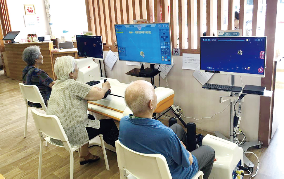 “在它們的陪伴下,康復就像做游戲,老人們都很喜歡玩。”據照護家園負責人施君潔介紹,當康復師設定好康復方案后,老人坐在電腦前,手肘放在肘托中,手指抓住操縱桿,屏幕上就會出現各種水果。老人可通過操縱桿上下左右移動抓水果,來達到康復訓練的目的。