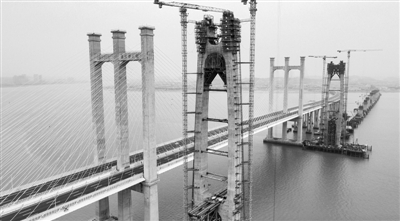 由于泉州灣航運繁忙,跨越主航道必須加大主跨。“通航孔主橋設計采用主跨400米雙塔鋼—混組合梁斜拉橋,兩側深水區引橋總長約4.3公里、采用3—70米無支座整體式剛構橋,為國內外鐵路斜拉橋首次。”曾甲華說。