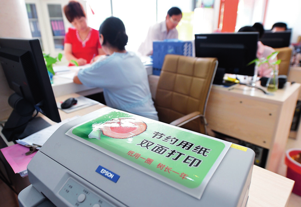 合肥市蜀山區文博苑社區的打印機貼著“節約用紙 雙面打印”的標識 郭晨攝 / 本刊