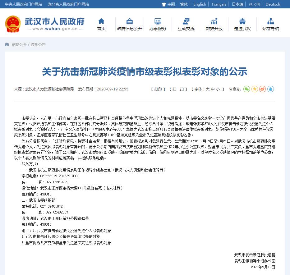 據(jù)武漢市人民政府網(wǎng)站消息,9月19日,武漢市抗擊新冠肺炎疫情表彰工作領(lǐng)導(dǎo)小組辦公室發(fā)布關(guān)于抗擊新冠肺炎疫情市級(jí)表彰擬表彰對(duì)象的公示,確定張鵬等870人為武漢市抗擊新冠肺炎疫情先進(jìn)個(gè)人擬表彰對(duì)象(含追授2人)。