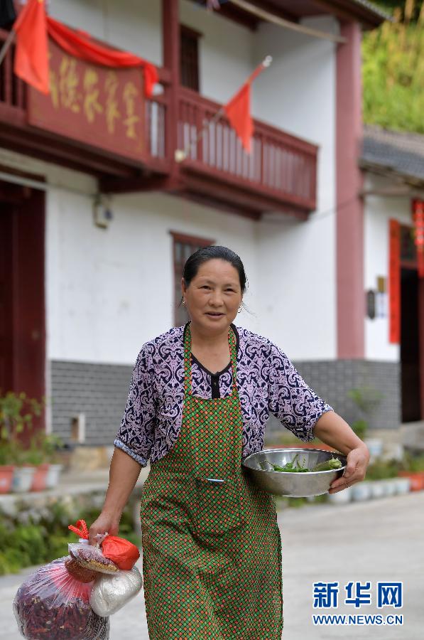 神山村村民彭夏英在自己開的農家樂給游客上菜(7月15日攝)。新華社記者 彭昭之 攝