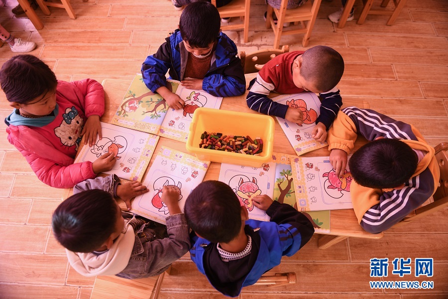 9月17日,在青海省果洛藏族自治州瑪沁縣拉加鎮中心幼兒園,孩子們正專心上著美術課。(新華網潘彬彬 攝)