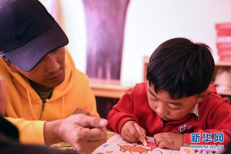 9月17日,青海省果洛藏族自治州瑪沁縣拉加鎮(zhèn)中心幼兒園的老師輔導(dǎo)孩子們上美術(shù)課。(新華網(wǎng)潘彬彬 攝)
