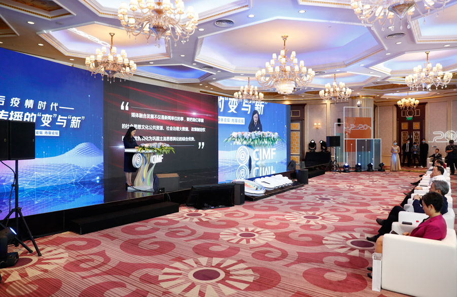 ??? 9月27日,2020中國(guó)網(wǎng)絡(luò)媒體論壇內(nèi)容論壇在上海舉行,各界嘉賓圍繞“后疫情時(shí)代網(wǎng)絡(luò)傳播的‘變’與‘新’”這一主題開(kāi)展探討和交流。圖為論壇現(xiàn)場(chǎng)。