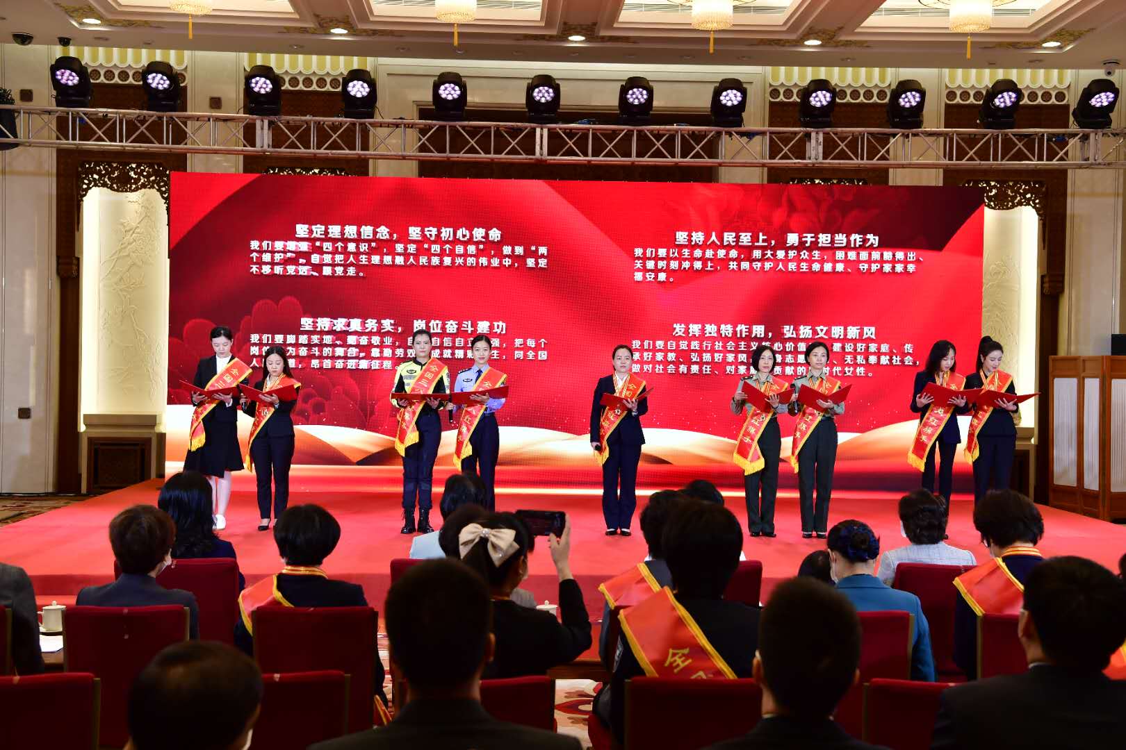 “堅定理想信念,堅守初心使命;堅持人民至上,勇于擔當作為;堅持求真務實,崗位奮斗建功;發揮獨特作用,弘揚文明新風。”桂小妹、劉海潮、肖利、范怡婷、周艷、陶源、薇婭、劉仙、謝小玉代表受表彰的抗疫全國三八紅旗手向全國姐妹們發出倡議,更加緊密地團結在以習近平同志為核心的黨中央周圍,弘揚偉大抗疫精神,爭做新時代最美巾幗奮斗者,努力創造無愧于時代、無愧于人民、無愧于歷史的業績,為建設社會主義現代化強國、實現中華民族偉大復興書寫嶄新的巾幗榮光。
