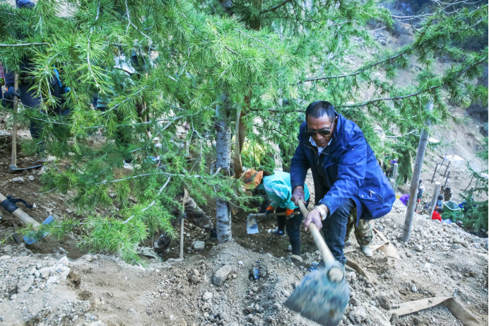 新冠肺炎疫情期間,巴拉格宗景區(qū)關(guān)閉,斯那定珠投入2000多萬(wàn)購(gòu)置了4萬(wàn)多棵樹(shù)苗,帶領(lǐng)200多個(gè)員工在景區(qū)植樹(shù)。 索朗農(nóng)布/攝