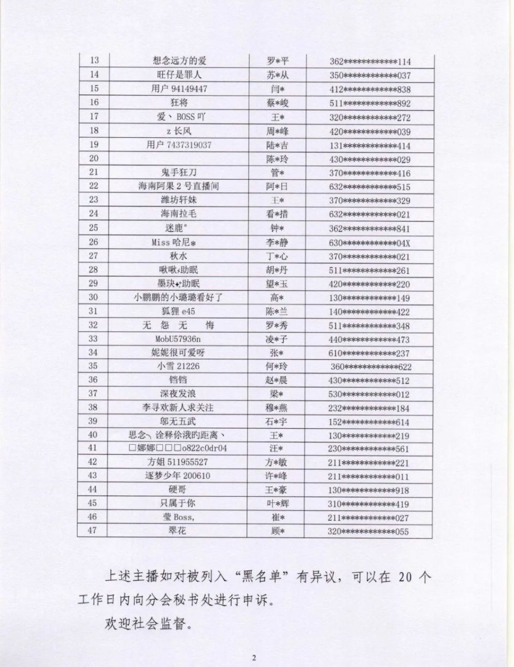 中國演出行業協會網絡表演(直播)分會透露,根據《互聯網文化管理暫行規定》《網絡表演經營活動管理辦法》《互聯網直播服務管理規定》等相關法律法規,按照《網絡表演(直播)行業主播“黑名單”管理制度》《黑名單認定工作流程》規定,向社會公布第七批主播黑名單,47名被列入黑名單的主播將在行業內禁止注冊和直播,封禁期限5年。(記者 韓軒)