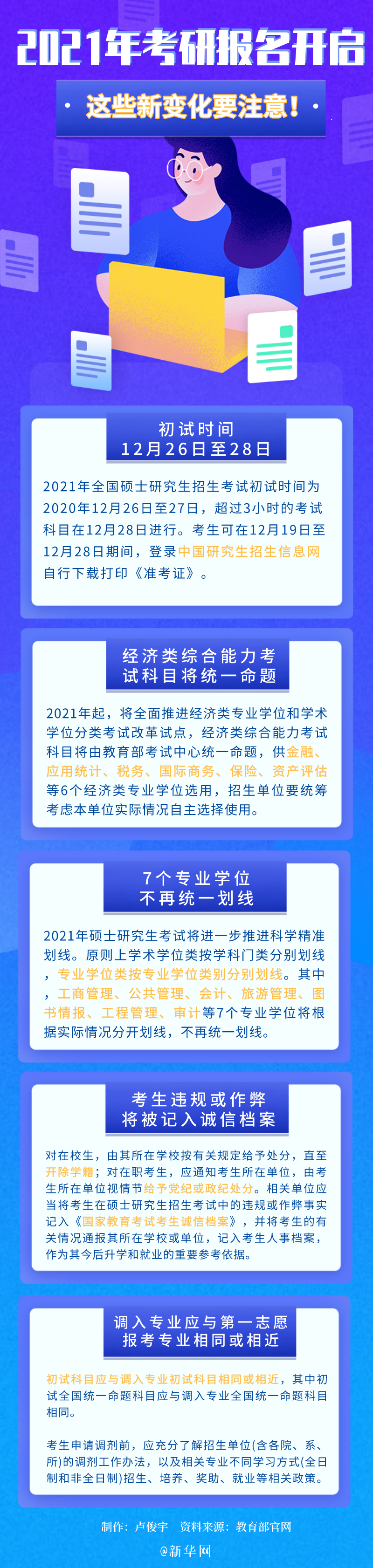 編輯: 盧俊宇 設(shè)計(jì): 2020年10月13日 09:43:50 來(lái)源: 新華網(wǎng)??? 10月10日起至10月31日,全國(guó)碩士研究生招生考試開(kāi)始正式報(bào)名,每天9:00-22:00,考生可登錄網(wǎng)上報(bào)名平臺(tái)填報(bào)報(bào)名信息。2021年研究生招生考試在考試命題、調(diào)劑、專(zhuān)業(yè)劃線(xiàn)等方面都有所調(diào)整,一圖帶你速覽這些方面的變化。