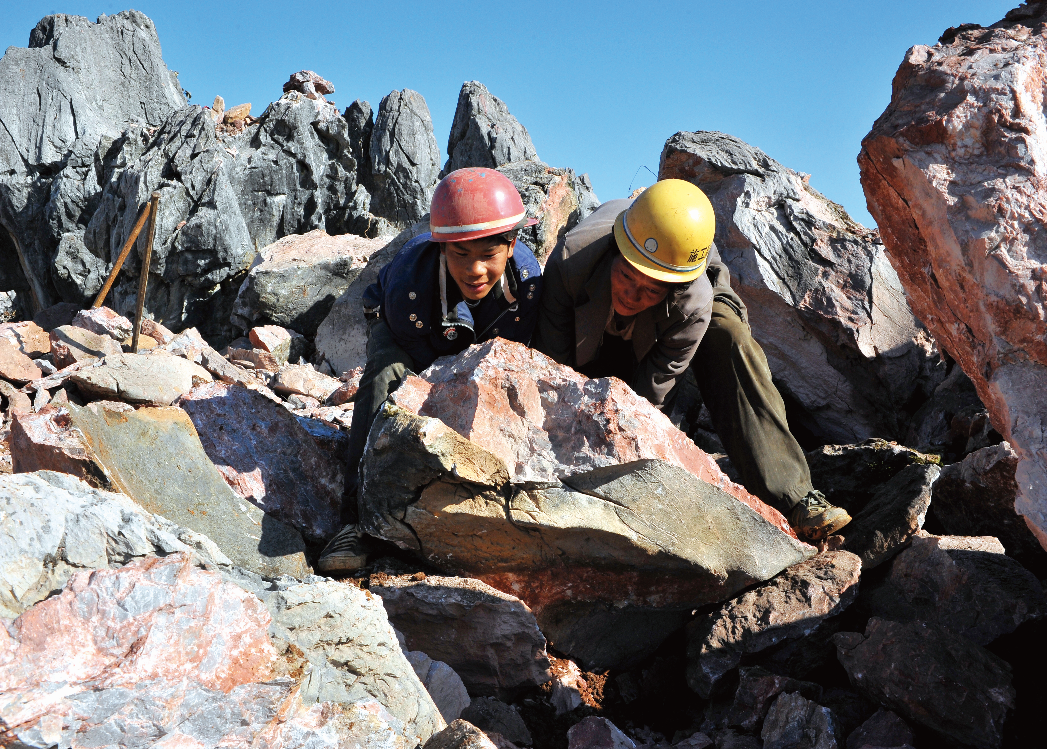 面對惡劣的生存環境,西疇人民“地瘦要壘埂,人窮要發狠”,用鏨子一點一點鑿,用大錘一錘一錘敲,用雙手一處一處刨,建成了“保水、保土、保肥”的三保臺地。圖為2010年蚌谷鄉長箐片區群眾正在實施土地整治。(呂德仁攝)