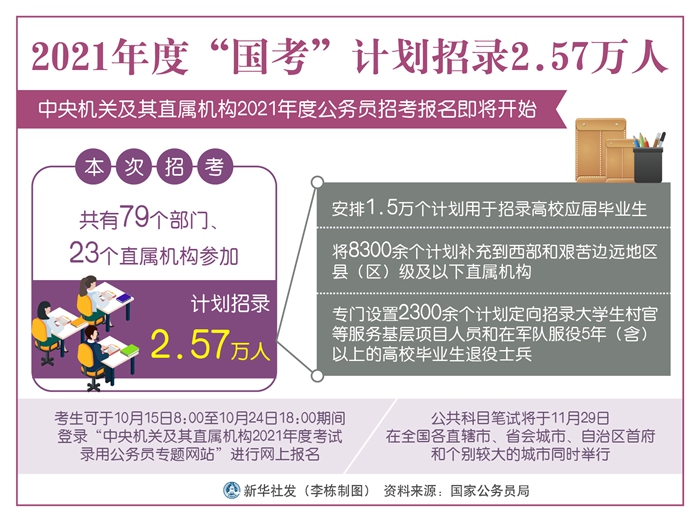 新華社北京10月14日電(記者林暉)記者14日從國家公務員局獲悉,中央機關及其直屬機構2021年度公務員招考報名即將開始,本次招考共有79個部門、23個直屬機構參加,計劃招錄2.57萬人。