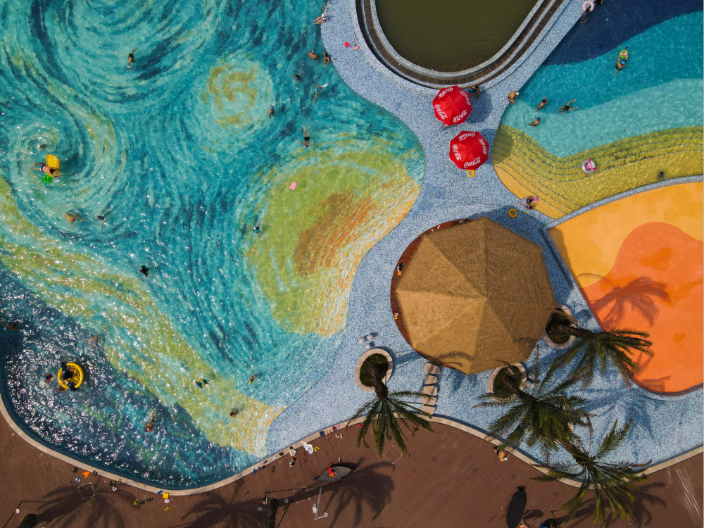 7月19日,成都江灘公園無(wú)邊泳池,因?yàn)橐哉蟾叩男强請(qǐng)D案為底,配上陽(yáng)光、沙灘、棕櫚樹(shù)、草亭等,讓人仿佛置身熱帶海灘