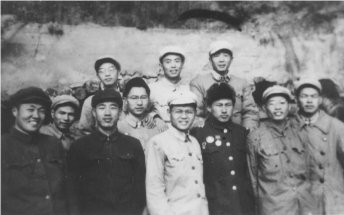 抗美援朝時期新華社前線記者與空軍英雄張積慧的合影,前排右起為蘇群、謝芝麟、張積慧、曾思明、劉紫池、殷步實;二排右起為丁德潤、崔佳山;三排右起為閻吾、徐熊、朱承修。