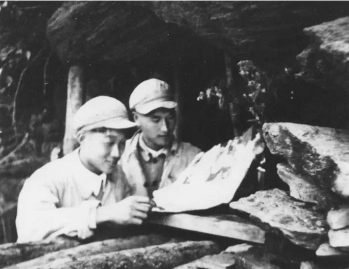 1951年抗美援朝第5次戰役期間,新華社記者李耐因隨軍(26軍)采訪,經常露營,寫稿子也常是在樹下、路邊或臨時搭起的棚子里。這是記者李耐因(右)在臨時搭起的防空棚下,向軍隊參謀人員請教戰況。