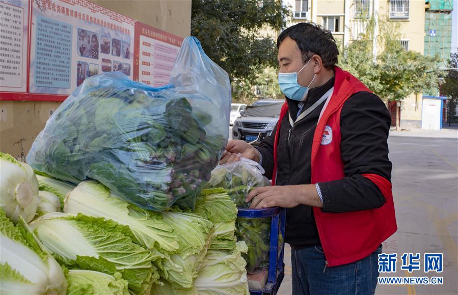志愿者在新疆喀什地區疏附縣托克扎克鎮團結路社區新絲路小區配送蔬菜(10月26日攝)。 新華社記者 胡虎虎 攝