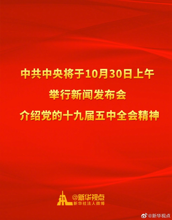 中共中央將于10月30日上午10時(shí)舉行新聞發(fā)布會(huì),介紹黨的十九屆五中全會(huì)精神。