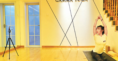 位于河北省秦皇島市海港區的一家瑜伽會所內,瑜伽教練正在通過直播的方式為學員講解課程。曹建雄攝(人民視覺)