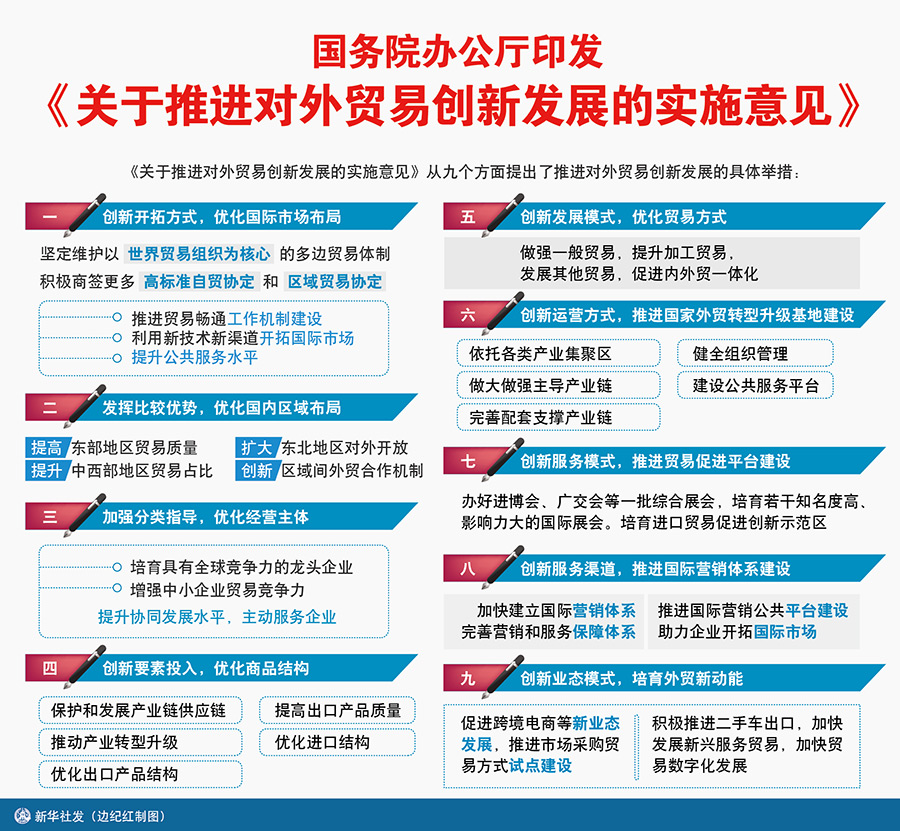 一是創新開拓方式,優化國際市場布局。堅定維護以世界貿易組織為核心的多邊貿易體制,積極商簽更多高標準自貿協定和區域貿易協定。推進貿易暢通工作機制建設,利用新技術新渠道開拓國際市場,提升公共服務水平。二是發揮比較優勢,優化國內區域布局。提高東部地區貿易質量,提升中西部地區貿易占比,擴大東北地區對外開放,創新區域間外貿合作機制。三是加強分類指導,優化經營主體。培育具有全球競爭力的龍頭企業,增強中小企業貿易競爭力,提升協同發展水平,主動服務企業。四是創新要素投入,優化商品結構。保護和發展產業鏈供應鏈,推動產業轉型升級,優化出口產品結構,提高出口產品質量,優化進口結構。五是創新發展模式,優化貿易方式。做強一般貿易,提升加工貿易,發展其他貿易,促進內外貿一體化。六是創新運營方式,推進國家外貿轉型升級基地建設。依托各類產業集聚區,做大做強主導產業鏈,完善配套支撐產業鏈,健全組織管理,建設公共服務平臺。七是創新服務模式,推進貿易促進平臺建設。辦好進博會、廣交會等一批綜合展會,培育若干知名度高、影響力大的國際展會。培育進口貿易促進創新示范區。八是創新服務渠道,推進國際營銷體系建設。加快建立國際營銷體系,完善營銷和服務保障體系。推進國際營銷公共平臺建設,助力企業開拓國際市場。九是創新業態模式,培育外貿新動能。促進跨境電商等新業態發展,推進市場采購貿易方式試點建設。積極推進二手車出口,加快發展新興服務貿易,加快貿易數字化發展。