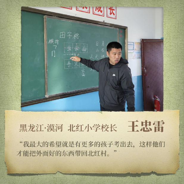 這所位于黑龍江省漠河市北極鎮北紅村的北紅小學只有兩位老師、3個年級和11名學生。“80后”校長王忠雷每天在數學、體育、思想品德三個科目中“周旋”。打開課件,他向學生熟練講授“體積與容積”相關知識的時候,隔壁教室傳來妻子于晶的語文課上孩子們瑯瑯的讀書聲……