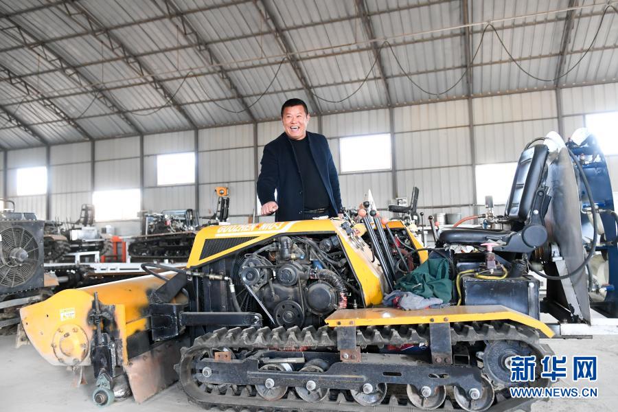 燒鍋村黨總支書記戴振武在展示他研發的能夠完成除草、施肥、灑藥等工作的綜合山地管理機,取名“果榛牛”(11月9日攝)。新華社記者 顏麟蘊 攝