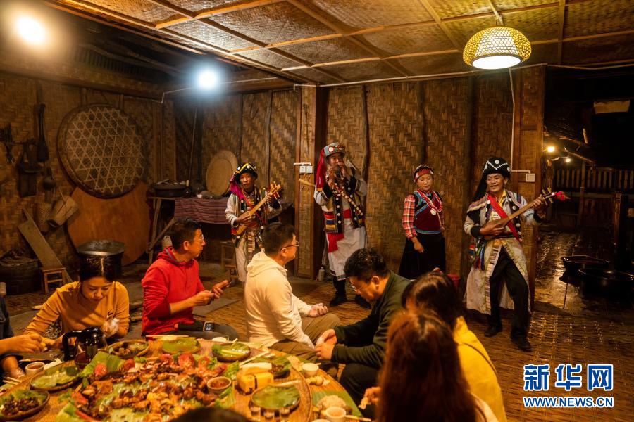 在怒江州福貢縣匹河怒族鄉老姆登村,怒族群眾郁五林(后排右三)在自家開的農家樂給客人表演民族歌舞(11月2日攝)。新華社記者 胡超 攝