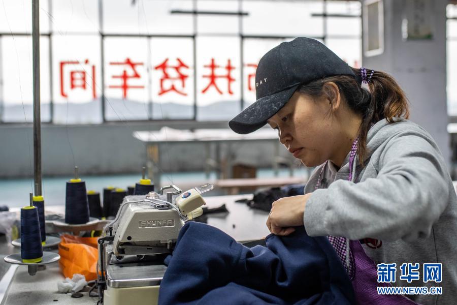 9月24日,搬遷戶龍先燕在鎮雄縣大地易地扶貧搬遷安置點銳烽服飾扶貧車間工作。新華社記者 胡超 攝