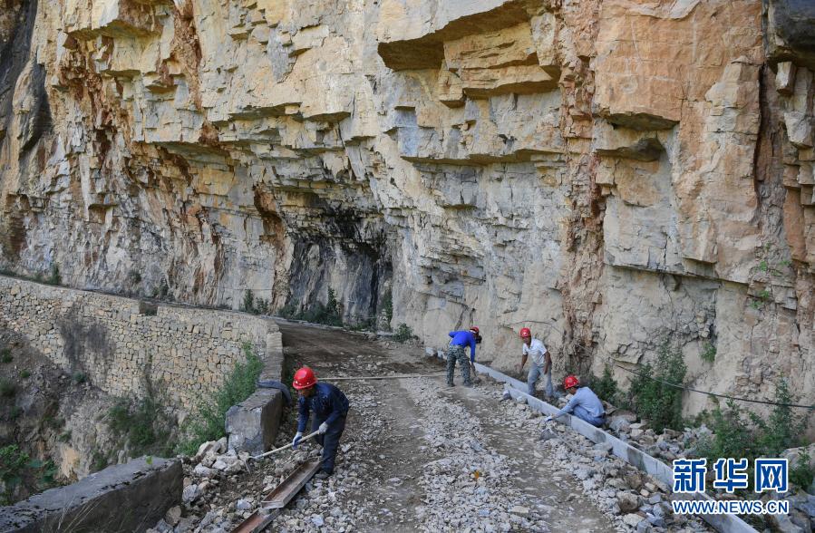 修路遠比想象的難。四周陡峭巖壁,很難找到落腳之地,膽子大的腰系長繩站在籮筐里,吊在幾百米高的懸崖邊鉆炮眼,先炸出一小塊立足之地,再用鋤頭、鋼釬和大錘,一塊一塊把石頭鑿下來。