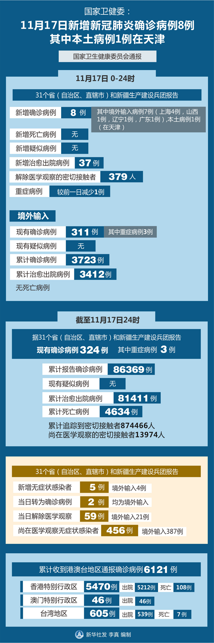 截至11月17日24時(shí),據(jù)31個(gè)省(自治區(qū)、直轄市)和新疆生產(chǎn)建設(shè)兵團(tuán)報(bào)告,現(xiàn)有確診病例324例(其中重癥病例3例),累計(jì)治愈出院病例81411例,累計(jì)死亡病例4634例,累計(jì)報(bào)告確診病例86369例,無現(xiàn)有疑似病例。累計(jì)追蹤到密切接觸者874466人,尚在醫(yī)學(xué)觀察的密切接觸者13974人。