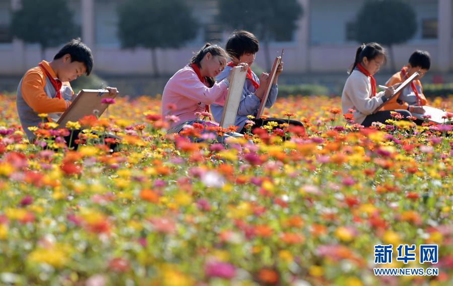 江西省宜春市袁州區(qū)寨下中心小學(xué)學(xué)生在花海上美術(shù)課(11月9日攝)。新華社記者 彭昭之 攝