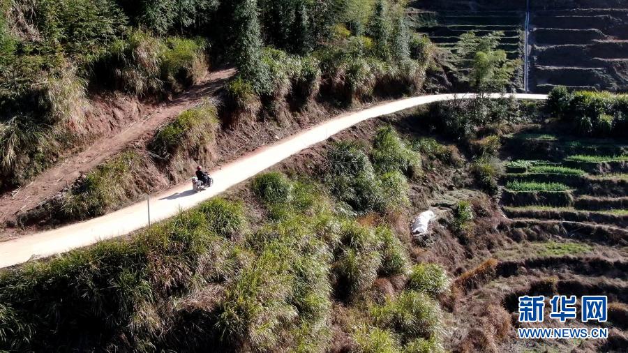 在江西省萬(wàn)載縣高村鎮(zhèn)新竹村,新竹小學(xué)的校長(zhǎng)羅長(zhǎng)石騎行在山路上(2月17日攝,無(wú)人機(jī)照片)。他要去最偏遠(yuǎn)的村組,給學(xué)生送當(dāng)天的線上教學(xué)課程。新華社記者 彭昭之 攝